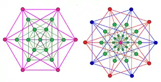 | Dual 5-simplexes (red and blue), and their birectified 5-simplex intersection in green, viewed in A5 and A4 Coxeter planes. The simplexes overlap in the A5 projection and are drawn in magenta. |