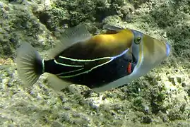 The reef triggerfish (Rhinecanthus rectangulus), also known as the rectangular triggerfish, wedgetail triggerfish[1] or by its Hawaiian name humuhumunukunukuāpuaʻa (pronounced [ˈhumuˈhumuˈnukuˈnukuˈwaːpuˈwɐʔə], meaning 'triggerfish with a snout like a pig',[2] also spelled humuhumunukunukuapua'a or just humuhumu for short), is one of several species of triggerfish. It is found at reefs in the Indo-Pacific[3] and is the state fish of Hawaii.