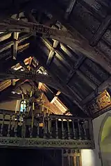 The chapel is set in pretty woodland some quarter mile from the busy A5 junction at Ty'n-y-cefn and maintained since 1990 by Cadw (a Welsh word meaning “to keep”, the historic environment service of the Welsh Government).[3] On buying a joint ticket to see this chapel with the ancient church at Llangar, some three miles away, the visitor will assume that the chapel is as plain inside as out but nothing could be further from the truth. On passage through the heavy oak west door the visitor enters a very small porch with barely enough room for two people before a second timber door. On the right a wall holds a bell rope and to the left is a timber staircase leading through a quarter landing to the right and to the gallery. Taking the stairs will afford the visitor a remarkable view of a church so ornate and richly adorned to be completely in contrast to the plain exterior. Immediately and closely visible is the rood roof ornately decorated throughout with intertwining rose motifs. Wall panels are intricately carved and painted, elaborately carved and painted angels adorn the walls the colours bright and clear. (See Gallery).[4]