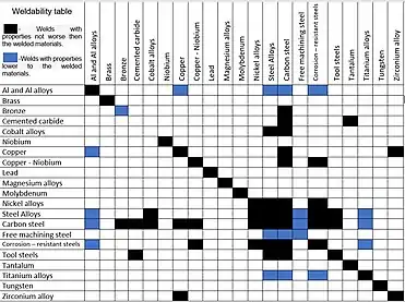 In rotary friction welding enables to weld various materials. Metallic materials of the same name or dissimilar either composite,[1] superalloys[25] and non-metallic e.g. thermoplastic polymers[26] can be welded and even welding of wood is investigated.[27] Weldability tables of metallic alloy can be found on the Internet and in books.[22] Sometimes an interlayer is used to connect non-compatible materials.[21][28]