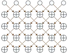 A configuration in Rule 90 can be partitioned into two subsets of cells that do not interact with each other. One of these two subsets consists of the cells in even positions at even time steps and the cells in odd positions in odd time steps. The other subset consists of the cells in even positions at odd time steps and the cells in odd positions at even time steps. Each of these two subsets can be viewed as a cellular automaton with only its half of the cells.[6] The rule for the automaton within each of these subsets is equivalent (except for a shift by half a cell per time step) to another elementary cellular automaton, Rule 102, in which the new state of each cell is the exclusive or of its old state and its right neighbor. That is, the behavior of Rule 90 is essentially the same as the behavior of two interleaved copies of Rule 102.[7]