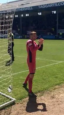 During the 2010–11 season he appeared on the bench on several occasions before suffering a setback by dislocating a thumb ruling him out for number of weeks.[9] After his recovery he made his senior début in the final game of the season on 7 May 2011 in a 3–0 victory against Raith Rovers in a Scottish First Division fixture where he kept a clean sheet.[10]