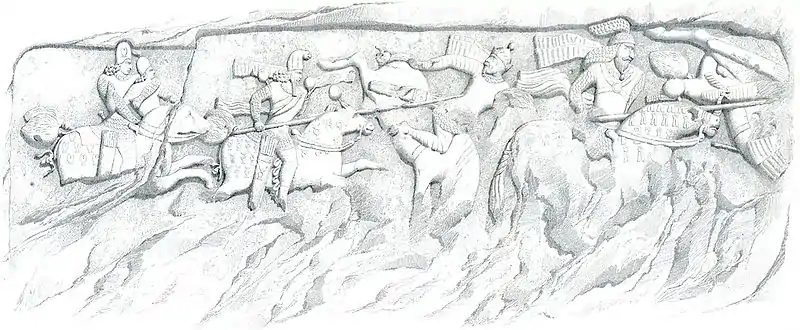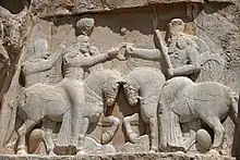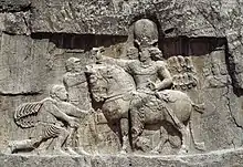 Rock-face relief at Naqsh-e Rostam of Persian emperor Shapur I (on horseback) capturing Roman emperor Valerian (standing) and Philip the Arab (kneeling), suing for peace, following the victory at Edessa.