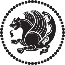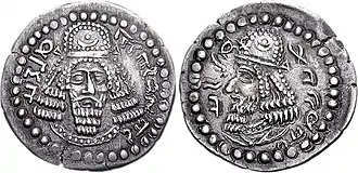 From around 370, however, towards the end of the reign of Shapur II, the Sasanians lost the control of Bactria to invaders from the north: first the Kidarites, then the Hephthalites and finally the Alchon Huns, who would follow up with the invasion of India.[48] These invaders initially issued coins based on Sasanian designs.[49] Various coins minted in Bactria and based on Sasanian designs are extant, often with busts imitating Sassanian kings Shapur II (r. 309 to 379) and Shapur III (r. 383 to 388), adding the Alchon Tamgha and the name "Alchono" in Bactrian script on the obverse, and with attendants to a fire altar on the reverse.[50]