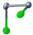 Selenium monochloride has the connectivity Cl-Se-Se-Cl. With a nonplanar structure, it has C2 molecular symmetry, similar to hydrogen peroxide and sulfur monochloride. The Se-Se bond length is 2.23 Å, and the Se-Cl bond lengths are 2.20 Å. The dihedral angle is 87°.[2]