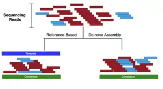- Mapping/Aligning: assembling reads by aligning reads against a template (AKA reference). The assembled consensus may not be identical to the template.