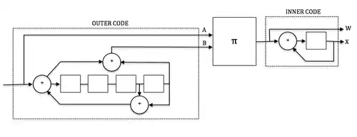 The example encoder is composed of a 16-state outer convolutional code and a 2-state inner convolutional code linked by an interleaver. The natural code rate of the configuration shown is 1/4, however, the inner and/or outer codes may be punctured to achieve higher code rates as needed. For example, an overall code rate of 1/2 may be achieved by puncturing the outer convolutional code to rate 3/4 and the inner convolutional code to rate 2/3.