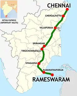Sethu Superfast Express, is a Superfast train route of the Southern Railway zone of the Indian Railways and runs between Chennai Egmore and Rameswaram via Chord line. It is a standard train consisting of 23 coaches. The train covers a distance of 602 km (374 mi) with an average speed of 57 km/h (35 mph)