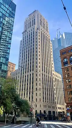 The Shell Building is an office tower in the Financial District of San Francisco, California. The 28-story, 115.22 m (378.0 ft), building is located at 100 Bush Street, at Battery Street. It was designed by George W. Kelham and built in 1929, in the architectural style of Gothic Moderne, Moderne and Art Deco.[4]