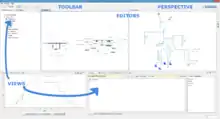 Simantics System Dynamics workbench window contains one or more perspective and perspectives contain different views and editors. Views are used to represent data in different ways. Editors are used for the actual modeling.[7]