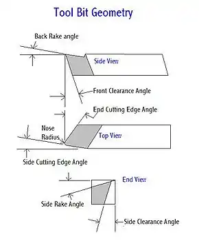 All the other angles are for clearance in order that no part of the tool besides the actual cutting edge can touch the work. The front clearance angle is usually 8 degrees while the side clearance angle is 10-15 degrees and partly depends on the rate of feed expected.