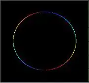 The images below illustrate the change in the direction of the gradient on a grayscale circle. When the sign of and are the same the gradient's angle is positive, and negative when different. In the example below the red and yellow colors on the edge of the circle indicate positive angles, and the blue and cyan colors indicate negative angles. The vertical edges on the left and right sides of the circle have an angle of 0 because there is no local change in . The horizontal edges at the top and bottom sides of the circle have angles of −π/2 and π/2 respectively because there is no local change in . The negative angle for top edge signifies the transition is from a bright to dark region, and the positive angle for the bottom edge signifies a transition from a dark to bright region. All other pixels are marked as black due to no local change in either or , and thus the angle is not defined. Since the angle is a function of the ratio of to pixels with small rates of change can still have a large angle response. As a result noise can have a large angle response which is typically undesired. When using gradient angle information for image processing applications effort should be made to remove image noise to reduce this false response.