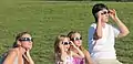 Amateur scientists observing eclipse in Albuquerque, New Mexico. They are using colored filtered glasses for safe viewing provided by the Department of Physics and Astronomy at The University of New Mexico.