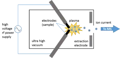 The high-voltage rf spark source is the one that was used in commercial SSMS instruments due to its ability to ionize both conducting and non-conducting materials. Typically, samples are physically incorporated into two conductive electrodes between which an intermittent (1 MHz) high-voltage (50-100 kV using a Tesla transformer) electric spark is produced, ionizing the material at the tips of the pin-shaped electrodes.[2] When the pulsed current is applied to the electrodes under ultra-high vacuum, a spark discharge plasma occurs in the spark gap in which ions are generated via electron impact. Within the discharge plasma, the sample evaporates, atomizes, and ionizes via electron impact.[7] The total ion current may be optimized by adjusting the distance between the electrodes. This mode of ionization can be used to ionize conducting, semi-conducting, and non-conducting samples.