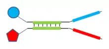 The yoctoreactor method introduced by Hansen et al.[21] is based on the geometry and stability of a three-dimensional DNA structure that creates a yoctoliter (10-24 L) size chemical reactor in which proximity of BBs brings about reactions among them. The DNA oligomers comprise the DNA-barcode for the attached BBs and form the structural elements of the reactor. One kind of yoctoreactor format is shown in the figure.