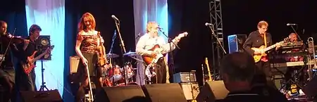 ![]() Stackridge being interviewed at the 2008 Glastonbury Festival. From the left: Andy Davis, James Warren, Mutter Slater and Crun Walter. | |