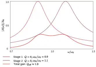 The bandwidth is thus reduced by a factor of . In terms of the number of stages .[3] Thus, the four stage synchronously tuned amplifier will have a bandwidth of only 19% of a single stage. Even in a two-stage amplifier the bandwidth is reduced to 41% of the original. Staggered tuning allows the bandwidth to be widened at the expense of overall gain. The overall gain is reduced because when any one stage is at resonance (and thus maximum gain) the others are not, unlike synchronous tuning where all stages are at maximum gain at the same frequency. A two-stage stagger-tuned amplifier will have a gain 3 dB less than a synchronously tuned amplifier.[4]