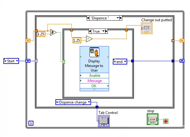 The "Dispense" case starts by first checking to make sure that the user has inserted enough money to buy an item. There is a second case structure in this case to handle the two options of either enough money, or not enough money. If there is enough money in the system, a message box will pop up saying thank you for purchasing the item, and then the amount of money it takes to purchase an item is subtracted from the total amount of money in the system. If there is not enough money in the system, the program outputs a new message saying that there is not enough money and sends out all of the money that was previously inserted before moving on to the "end" case.
