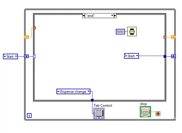 In the vending-machine example we are using shift registers to pass around the total amount of money in the machine and the enumerated constants that control which case we are in. When we look at our start-case picture, we can see the shift registers on the left and right side and the enumerated constants in the middle. We can also see at the bottom of the picture a tab that is used to display each individual section is being written to as an indicator. By doing this, we remove the possibility of the user getting off of the loop and locking them into the case they are supposed to be in. When we are in the start stage of the program, we want to make sure that the user is right there with the program.