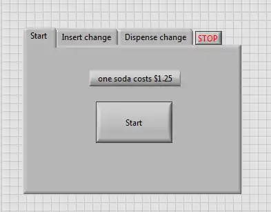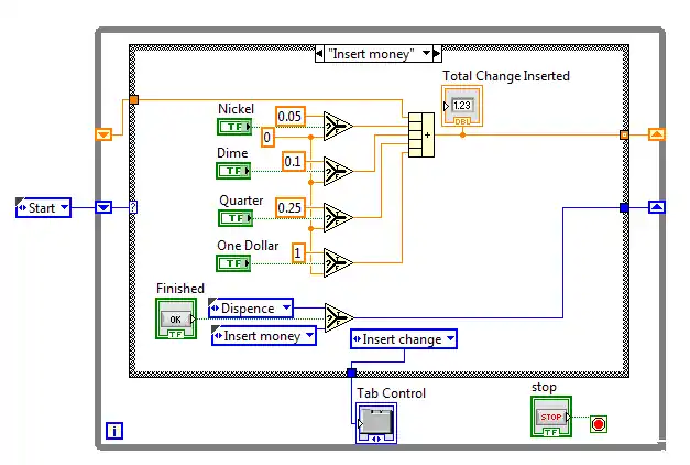 The "Insert money case" also changes which tab is being displayed to the "Insert change" tab on the block diagram. Here the user can insert money and also see how much money was through the "Total Change Inserted" display.
