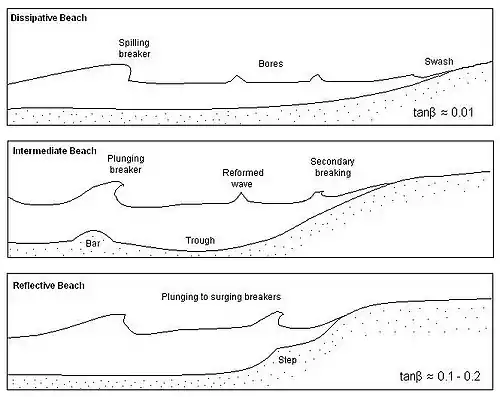 Where Hb is the breaker height, g is gravity, T is the incident-wave period and tan β is the beach gradient. Values εb>20 indicate dissipative conditions where swash is characterised by standing long-wave motion. Values εb<2.5 indicate reflective conditions where swash is dominated by wave bores.[3]