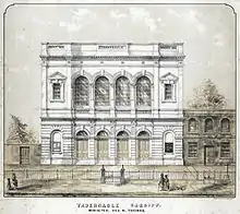 A chapel existed on the site from 1821, enlarged in 1840, then further enlarged and rebuilt between 1862 and 1865 in an Italianate style under local architect J. Hartland and Son. The front of the building has evidence of redevelopment rather than a complete rebuild, with one of the stair towers projecting beyond the main facade and the four upper windows appearing off-centre when viewed from inside.[3]