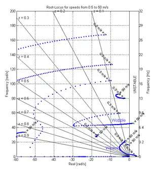 Once a turn is established, the torque that must be applied to the steering mechanism in order to maintain a constant radius at a constant forward speed depends on the forward speed and the geometry and mass distribution of the bike.[11][23] At speeds below the capsize speed, described below in the section on Eigenvalues and also called the inversion speed, the self-stability of the bike will cause it to tend to steer into the turn, righting itself and exiting the turn, unless a torque is applied in the opposite direction of the turn. At speeds above the capsize speed, the capsize instability will cause it to tend to steer out of the turn, increasing the lean, unless a torque is applied in the direction of the turn. At the capsize speed no input steering torque is necessary to maintain the steady-state turn.