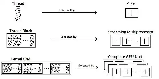 Although we have stated the hierarchy of threads, we should note that, threads, thread blocks and grid are essentially a programmer’s perspective. In order to get a complete gist of thread block, it is critical to know it from a hardware perspective. The hardware groups threads that execute the same instruction into warps. Several warps constitute a thread block. Several thread blocks are assigned to a Streaming Multiprocessor (SM). Several SM constitute the whole GPU unit (which executes the whole Kernel Grid).