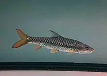 Tor putitora, the Putitor mahseer, Himalayan mahseer, or golden mahseer, is an endangered species of cyprinid fish that is found in rapid streams, riverine pools, and lakes in the Himalayan region. Its native range is within the basins of the Indus, Ganges and Brahmaputra rivers.[1] It is a popular gamefish, once believed to be the largest species of mahseer, and can reach up to 2.75 m (9.0 ft) in length and 54 kg (119 lb) in weight, though most caught today are far smaller.[2] It is threatened by habitat loss, habitat degradation and overfishing, and it already has declined by more than an estimated 50%.[1] This omnivorous species is generally found near the surface in water that ranges from 13 to 30 °C (55–86 °F).[3]