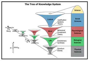 The Tree of knowledge (ToK) system is a new map of Big History that traces cosmic evolution across four different planes of existence, identified as Matter, Life, Mind and Culture that are mapped respectively by the physical, biological, psychological and social domains of science. The Tree of Knowledge (ToK) System was developed by Gregg Henriques, who is a professor and core faculty member in the Combined-Integrated Doctoral Program in Clinical and School Psychology at James Madison University.[1] The ToK System is part of a larger Unified Theory of Knowledge that Henriques describes as a consilient scientific humanistic philosophy for the 21st Century.