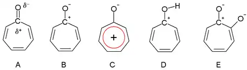 Dewar in 1945 proposed that tropones could have aromatic properties. The carbonyl group is more polarized as a result of the triene ring, giving a partial positive charge on the carbon atom (A) and a partial negative charge on oxygen. In an extreme case, the carbon atom has a full positive charge (B) forming a tropylium ion ring which is an aromatic 6 electron system (C).