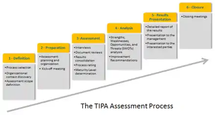 Interviews with process actors are used to understand the way the process is performed and a process maturity rating scale is used to measure the gap between the frame of reference and the field reality. An assessment project starts with a clear goal statement to define the scope of the project. The project involves a series of roles who take part in the assessment. The project is organized in 6 phases. It is supported by several tools (templates and spreadsheets) provided in the TIPA Toolbox.[3]