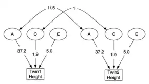 An example structural model (for the heritability of height among Danish males)[17] is shown: