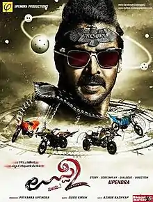 Uppi 2 (titled Upendra 2 in Telugu) is a 2015 Indian Kannada-language psychological thriller film written, directed and starring Upendra in the lead role, and is a sequel to his 1999 film Upendra, and was produced under his production company, Upendra Productions. Alongside Upendra, the film stars Kristina Akheeva and Parul Yadav in lead roles. The supporting cast features Sayaji Shinde, Shobhraj, Satyajit, Bank Janardhan and Mimicry Dayanand. The soundtrack and film score were composed by Gurukiran.[2] The dubbed Telugu version titled Upendra 2, was released the same day.[3]
