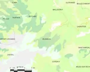 Valmanya is located in the canton of Le Canigou and in the arrondissement of Prades.