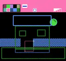 This application allows players to create artwork using a mostly freestyle method, with support for full video animation. The game does not support the use of a mouse or any other external component, requiring users to rely on the NES game controller to draw objects. There is a basic grey screen surrounded by graphics stamps. This application utilizes the CHR RAM chip that is also used in a variety of other contemporaneous NES video games. Thirteen different variations of palettes and seven different kinds of tools (including various geometric shapes and the eraser) are available for use in creative compositions.[5] Once the user chooses one of the palettes, there are different colors to choose. The colors include these: turquoise, pink, purple, light blue, and colors that have been dithered.