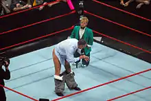 On the February 13, 2003 SmackDown!, McMahon tried to derail the return of Hulk Hogan after a five-month hiatus but was knocked out by Hogan and received a running leg drop.[66] At No Way Out, McMahon interfered in Hogan's match with The Rock. Hogan hit The Rock with a running leg drop and went for the pin, but the lights went out. When the lights came back on, McMahon came to the ringside to distract Hogan. Sylvain Grenier, the referee, gave The Rock a chair, which he then hit Hogan with. He ended the match with a Rock Bottom to defeat Hogan.[67] This led to McMahon facing Hogan in a match at WrestleMania XIX, which McMahon lost in a Street Fight.[68] McMahon then banned Hogan from the ring but Hogan returned under the gimmick of "Mr. America". McMahon tried to prove that Mr. America was Hogan under a mask but failed at these attempts. Hogan later quit WWE and at which point McMahon claimed that he had discovered Mr. America was Hulk Hogan and "fired" him.[69]