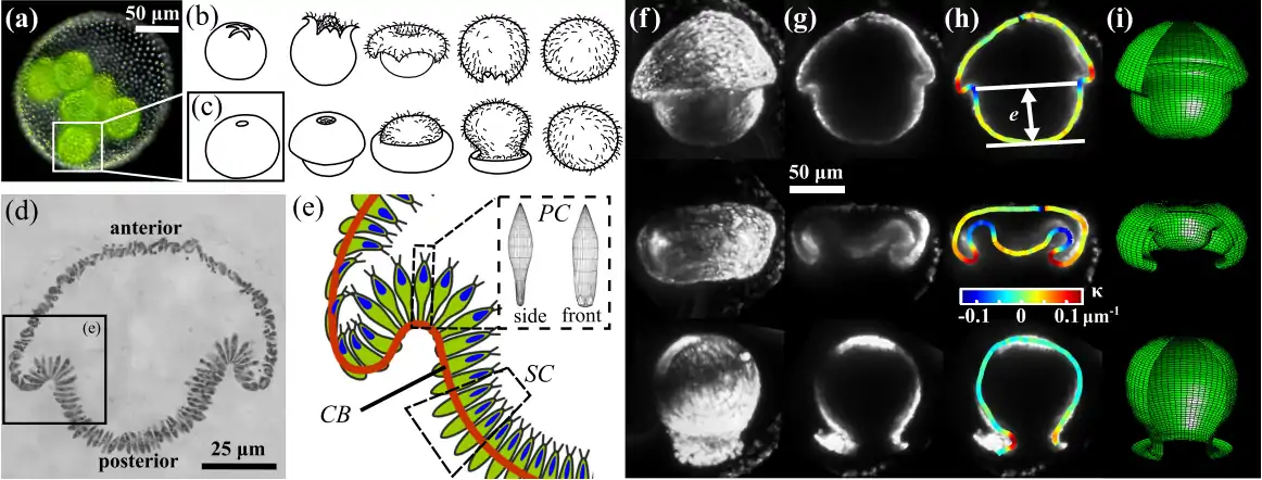 Embryonic inversion in Volvox. (a) Adult V. globator spheroid containing multiple embryos. (b) Embryo undergoing type-A inversion (e.g., V. carteri). (c) Embryo undergoing type-B inversion (e.g., V. globator, V. aureus). (d) Light micrograph shows semi-thin section of V. globator embryo exhibiting different cell shapes. (e) Schematic representation of cells in region marked in (d). PC: paddle-shaped cells, two different views illustrate anisotropic shape; SC: spindle-shaped cells; red line: position of cytoplasmic bridges (CB). (f) 3D renderings of a single V. globator embryo in three successive stages of inversion. (g) Optical midsagittal cross sections of embryo in (f). (h) Traced cell sheet contours overlaid on sections in (g), with color-coded curvature κ. (i) Surfaces of revolution computed from averaged contours.[12]