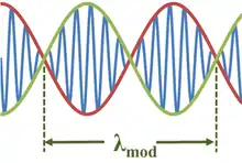 The modulation wavelength is double that of the envelope itself because each half-wavelength of the modulating cosine wave governs both positive and negative values of the modulated sine wave. Likewise the beat frequency is that of the envelope, twice that of the modulating wave, or 2Δf.[4]