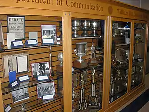 The WPDU has participated in, and traveled extensively to intercollegiate debate competitions since its early history.[8] A regular participant regional and national competitions, the WPDU has previously won the Pennsylvania State Debating Championship,[9] qualified for the National Debate Tournament forty-five times,[3][4] and captured the 1981 National Debate Tournament national championship.[6] In addition, at the 1947 Grand National Forensic Tournament,[10] a two-man affirmative debate team won the national championship competing against 89 other teams, while Pitt's negative team finished as runners-up.[2] The WPDU has also finished first in the American Debate Association’s varsity rankings and its debaters have won hundreds of individual speaking awards.[11] In the past the WPDU hosted major intercollegiate debating competitions,[12][13] and through the years, the team has appeared on television,[14] including once hosting its own weekly television show in the 1950s,[15] and its success has enjoyed coverage in local and regional media.[16][17][18]