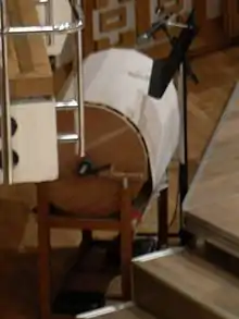 The wind machine is constructed of a large cylinder made up of several wooden slats which measures approximately 75–80 centimeters in diameter.[2][3] The cylinder body of the instrument rests upon a stand and is typically covered with silk, canvas, or other material which is in a fixed position. A crank handle, used by the player to rotate the cylinder and create the sound, is attached to the cylinder.[1]