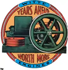 The Witte Iron Works was a maker of hit and miss engines. The company was started in 1870 by August Witte in Kansas City. His son Ed Witte built the company's first crude gasoline engine in 1886. In 1894 gas engines would be the company's primary focus.[1] They made the Witte's Junior Headless engine, Witte portables, and a Dragsaw. In 1911 they started manufacturing the Simplicity line of engines. These engines were the first of the Witte models to carry the walking-beam valve mechanism that characterized the entire line until November, 1923. Witte declared that their engines paid for themselves, making them practically free. Their engines could come with saws and mud pumps.[2] In the 1930s Witte began to offer diesel engines. Witte was purchased by the United States Steel Company in 1944. In 1966, the company once again operated as a privately-owned entity.[3]