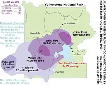 The caldera formed during the last of three supereruptions over the past 2.1 million years: the Huckleberry Ridge eruption 2.1 million years ago (which created the Island Park Caldera and the Huckleberry Ridge Tuff), the Mesa Falls eruption 1.3 million years ago (which created the Henry's Fork Caldera and the Mesa Falls Tuff), and the Lava Creek eruption approximately 640,000 years ago (which created the Yellowstone Caldera and the Lava Creek Tuff).[5]